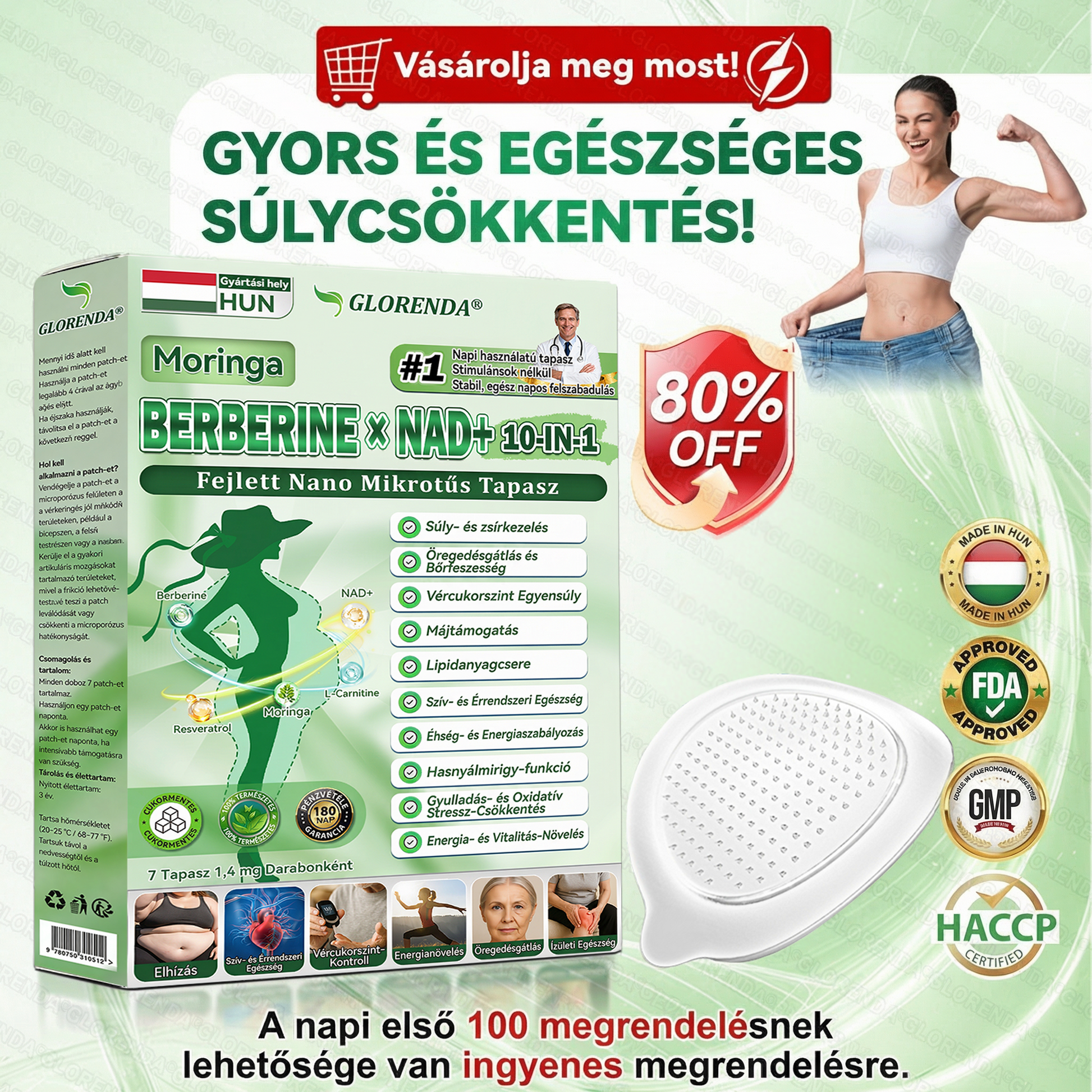 𝑮𝑳𝑶𝑹𝑬𝐍𝐃𝗔®𝗠𝗼𝗿𝙞𝙣𝙜𝙖 · 𝘽𝙚𝙧𝙗𝙚𝙧𝙞𝙣𝒂 × 𝑵𝑨𝐃+ 𝐒𝙪𝙥𝙚𝙧 𝗠𝗶𝗰𝗿𝗼𝗻𝗮𝗹𝗴𝗮 𝑵𝒂𝐧𝐨 10-az-1-benEz a termék több mint 20 év kutatás eredményeként jött létre, több mint 30 szakértőből álló multidiszciplináris csapat fejlesztette ki. Minden tapasz ultra-vékony mikrotűs szerkezettel rendelkezik, amelyek vastagsága körülbelül egy heted része az emberi hajszálnak, így biztosítva a gyengéd és szinte fájdalommentes alkalmazást.A formula rendkívül koncentrált, természetes bioaktív vegyületeket tartalmaz, akár 20-szor magasabb szinten, mint a hagyományos piaci termékek, beleértve a Moringát és a Berberint, amelyek szinergikusan támogatják az egészséges vércukorszint-szabályozást, az étvágy kontrollját és a lipidanyagcserét, elősegítve ezzel a fokozatos és fenntartható testsúly-kezelést.Az NAD+ hozzáadásával a tapasz hozzájárul a bőr feszességéhez és rugalmasságához a súlyingadozások során, segítve a karcsú megjelenés megőrzését anélkül, hogy a kényelmet vagy az esztétikát kompromittálná.Más, magas hatékonyságú összetevők támogatják az immunrendszer működését, az emésztőrendszer egészségét, a bélflóra egyensúlyát, a nők egészségét, a napi energiaszintet és a fáradtság csökkentését, elősegítve egy fiatalosabb és ellenállóbb fiziológiai állapot kialakulását belülről.Ez a termék megfelel a Magyar Egészségügyi Vita Szervezet által meghatározott minőségi szabványoknak, és nem igényel injekciót. Tudományos alapokon nyugszik, biztonságos és teljes megoldást kínál a testsúly hatékony szabályozására és a hosszú távú anyagcsere-egészség támogatására, úgy kialakítva, hogy a testtel összhangban működjön, ne ellene.
